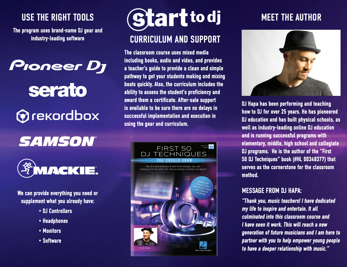 Partner with us and bring DJ education into the classroom to help unlock a deeper relationship with music for students of all grade levels, without the need for prior musical experience. This program will give you all of the tools you need to be able to deliver the best possibly experience for your students!